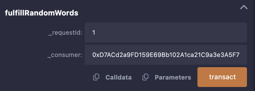 2. Click fulfillRandomWords and fill in _requestId with your VRF request ID and _consumer with your consumer contract address.